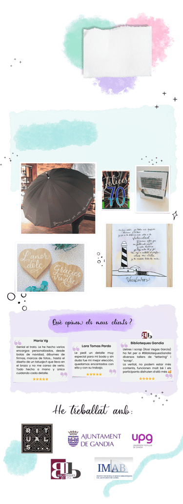 Amb la meua cal·ligrafia feta a mà, un toc d'aquarel·les i la tècnica del scrap, done vida a creacions que conten la teua història.
